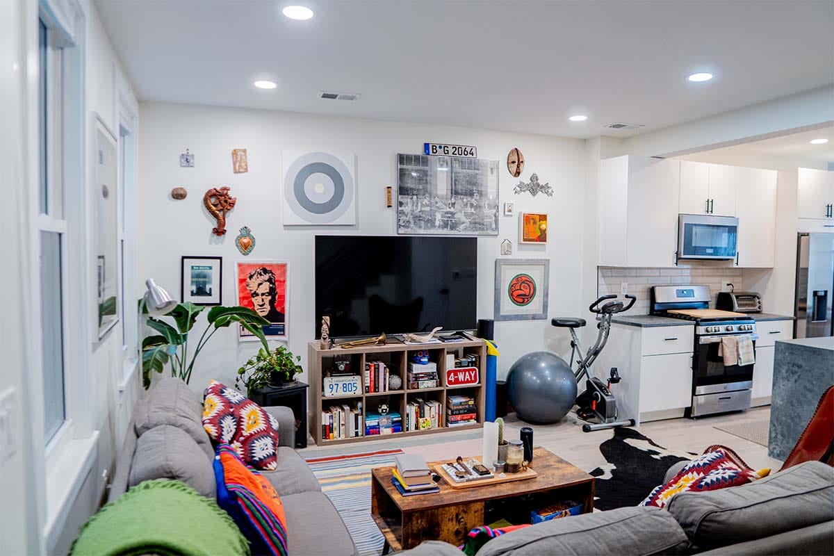 In this Washington, DC rowhouse, we completed a full first-floor remodel. The homeowner wanted a more spacious and open layout, as the original kitchen, living room, and dining room felt cramped. We removed interior walls and transformed the entire level into an open-concept design that now includes a modern kitchen, living room, dining area, powder room, and a new broom closet – creating a brighter, more functional space.